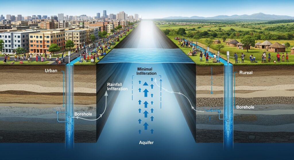 Studies in major cities like Calabar show that urban expansion and impervious surfaces significantly reduce natural rainwater infiltration, directly impacting recharge rates and aquifer sustainability (ScienceDirect)
